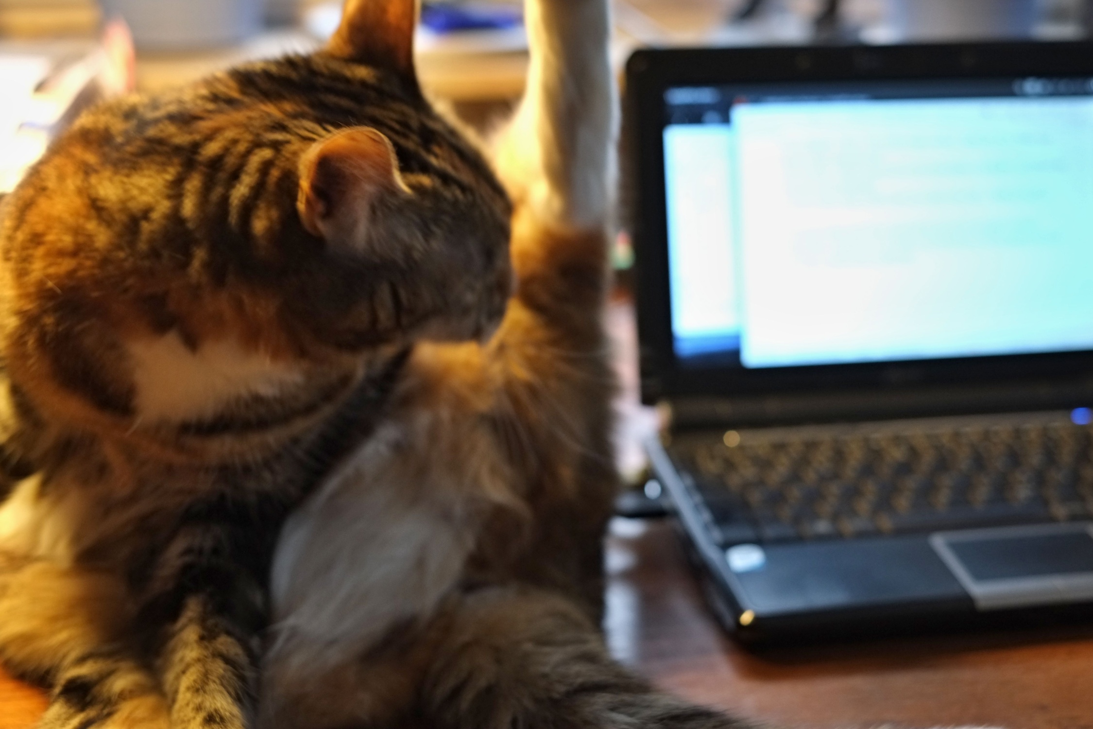 Natürlich werde ich meine frühmorgendliche Energie nicht mit Katzenspielereien vergeuden. Da Tiewie nicht locker lässt und inzwischen neben meinem rechten Bein sitzt, beim Schnurren noch einen Gang hochgeschaltet hat und mit der Krallen bewehrten Pfote begonnen hat, gemächlich aber nachdrücklich die Schutzwirkung von Stoffhosen gegen Katzenkrallen zu testen, fuchtele ich mit meiner Linken in Bodennähe in der Luft herum um die Kätzin von meinem Bein abzulenken. Es ist ein nur halbherziges Spielangebot, auf das sie für eine kurze Zeit einsteigt. Während meine Linke also mit der Katze beschäftigt ist klickt die Rechte mit der Maus (?) herum, um die benötigten Dateien auf dem Desktop in passenden Fenstern zu öffnen. Dann beginne ich, das am Vortag Geschrieben noch einmal durchzulesen um wieder in die Materie hineinzukommen.