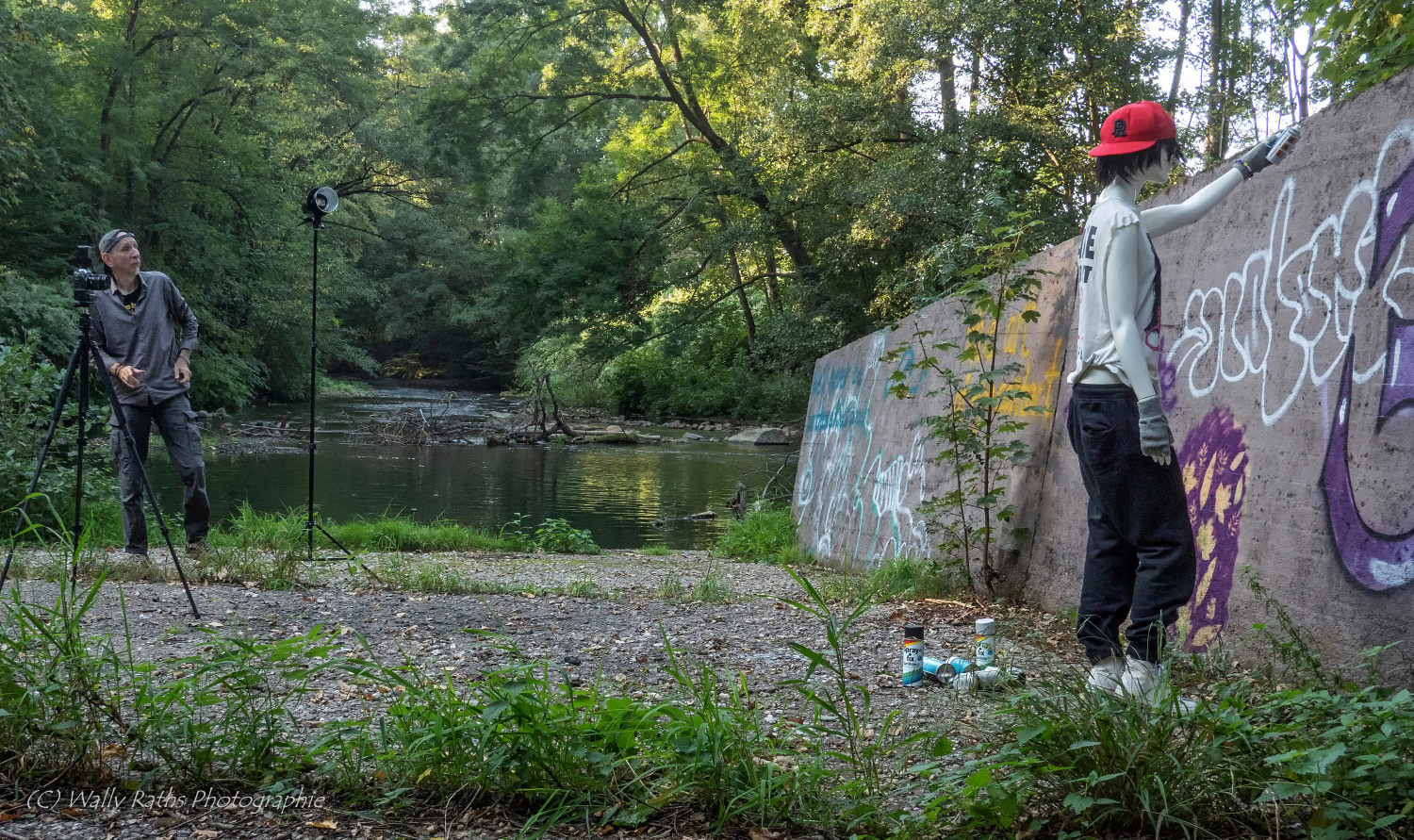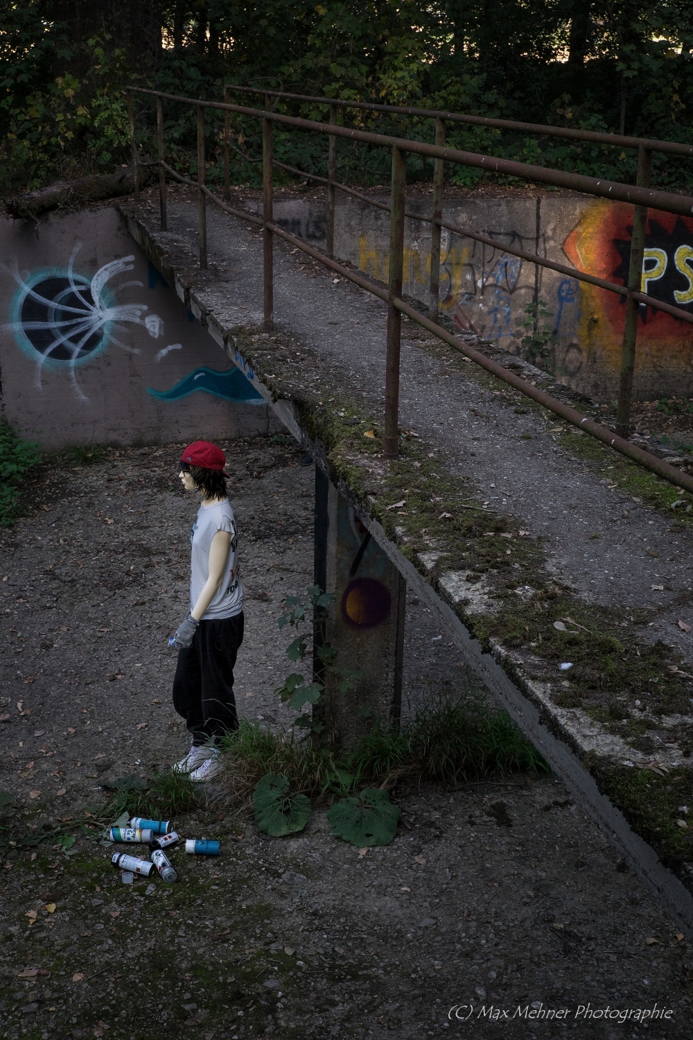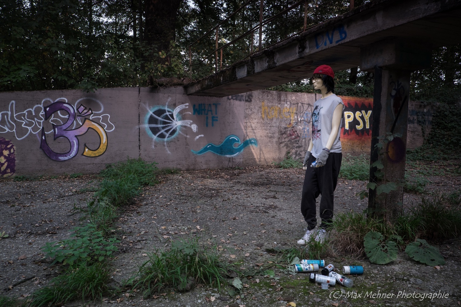Für eine der Aufnahmen gebrauche ich den Selbstauslöser, setze mich im Hintergrund selbst noch als Sprayer in Szene.