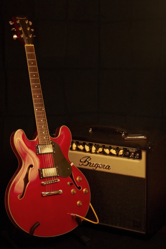 Auch Bild drei wurde mit großer Blende (2.0) aufgenommen. Hier war das Problem, eine schöne weiche Reflexion auf dem Gitarrenkorpus zu erzielen, daher musste der Winkel zwischen Korpusoberfläche und Lichtquelle so oft variiert werden bis es passte.
