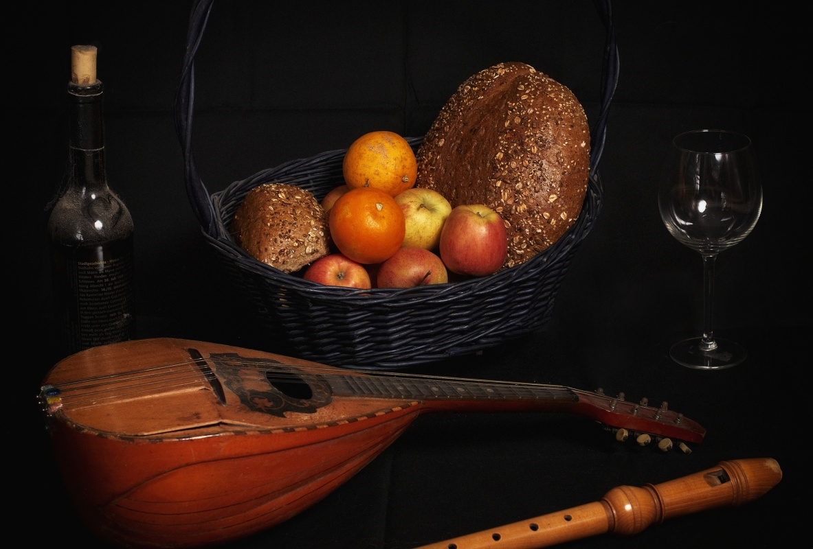 Das Stillleben mit Instrumenten, Obst und Brot dagegen sollte eine durchgehende Schärfe bekommen, so wurde dafür Blende 6.3 gewählt. Und diese Aufnahme ist, im Gegensatz zu den anderen, geblitzt.