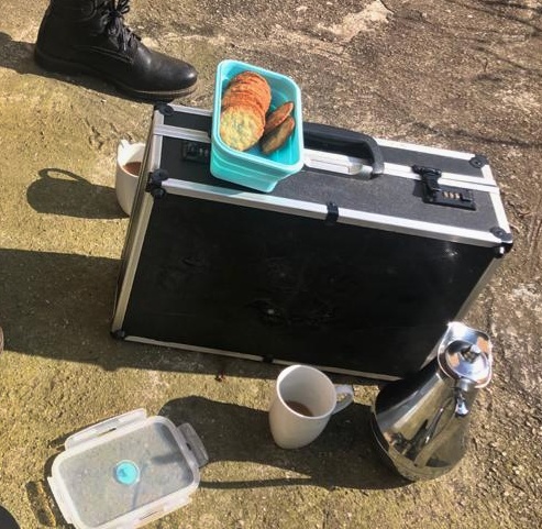 Die Luft war eher kühl, aber wenn die Sonne hinter den großen Wolken hervorkam, wurde es angenehm warm auf dem Hof mit den alten Garagen, die den Hintergrund für das Shooting bilden sollten. Nach einem entspannten Vorgespräche mit Ralf in einer Ecke des Hofes bei Kaffee und leckeren Haferkeksen war konzentrierte, sorgfältige Arbeit angesagt, um die Portraits von Ralf so hinzubekommen, wie ich mir das vorstellte.