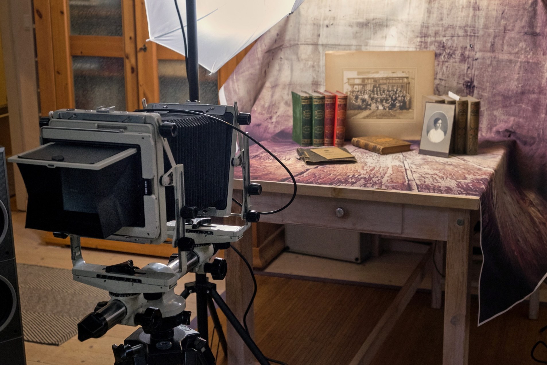 Die Kassetten der Toyo lud ich wieder mit 100er Fomapan, klemmte das 240er Symmar-S an die Frontstandarte, dann suchte ich, bewaffnet mit meiner Lupe, mit immer wieder prüfendem Blick durch die Mattscheibe den richtigen Winkel für den Front-Tilt, um einen möglichst großen Schärfebereich zu erhalten. Licht gab ich mittels eines Durchlichtschirms auf die Szene – zu Testzwecken einmal mit Dauerlicht, dann mittels Blitz.