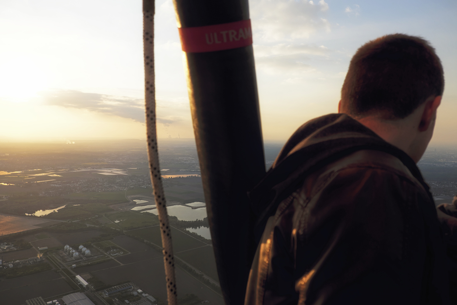 Kurz darauf kam dann auch für uns das Kommando: Alles rein in die Gondel – aber schnell. Eine Minute später waren wir dann schon oben und auf dem Weg zu einer fantastischen Fahrt, die uns den Rhein entlang führte Richtung Bonn, vorbei an der Fabrikanlage von Wesseling mit ihren großen Tanks und Rohren.