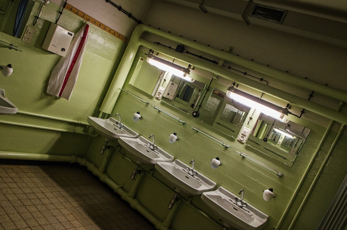 und die Dauer Ihrer Abwesenheit informieren zu können und stehen nun in der Eingangsschleuse. Zuerst heißt es nun, Ihre möglicherweise verstrahlten Kleider ablegen, das werden Sie dort hinter dieser Tür tun, und dann gehen Sie bitte zum Dekontaminieren unter die Duschen. Sie bekommen dann neue Kleider, anschließend werden Ihnen Ihre Schlafplätze in den 6-Bett-Zimmern gezeigt…