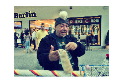 Charlottenburg, auf dem Rückweg zu unserem Hotel an der Liegnitzer Straße. Ein Karren, davor ein Mann unbestimmten Alters. Beim Näherkommen sehen wir die Ratten, drei große Tiere und zwei kleine. Die Kleinen ruhen sich im Käfig aus, die großen laufen auf ihm herum wie winzige Katzen, rollen sich auf den Rücken, lassen sich von ihm am Bauch kraulen, fast glaube ich ihr Schnurren hören zu können. Wir kommen ins Gespräch, Belanglosigkeiten, dabei erfahren wir, dass er aus Prag kommt.