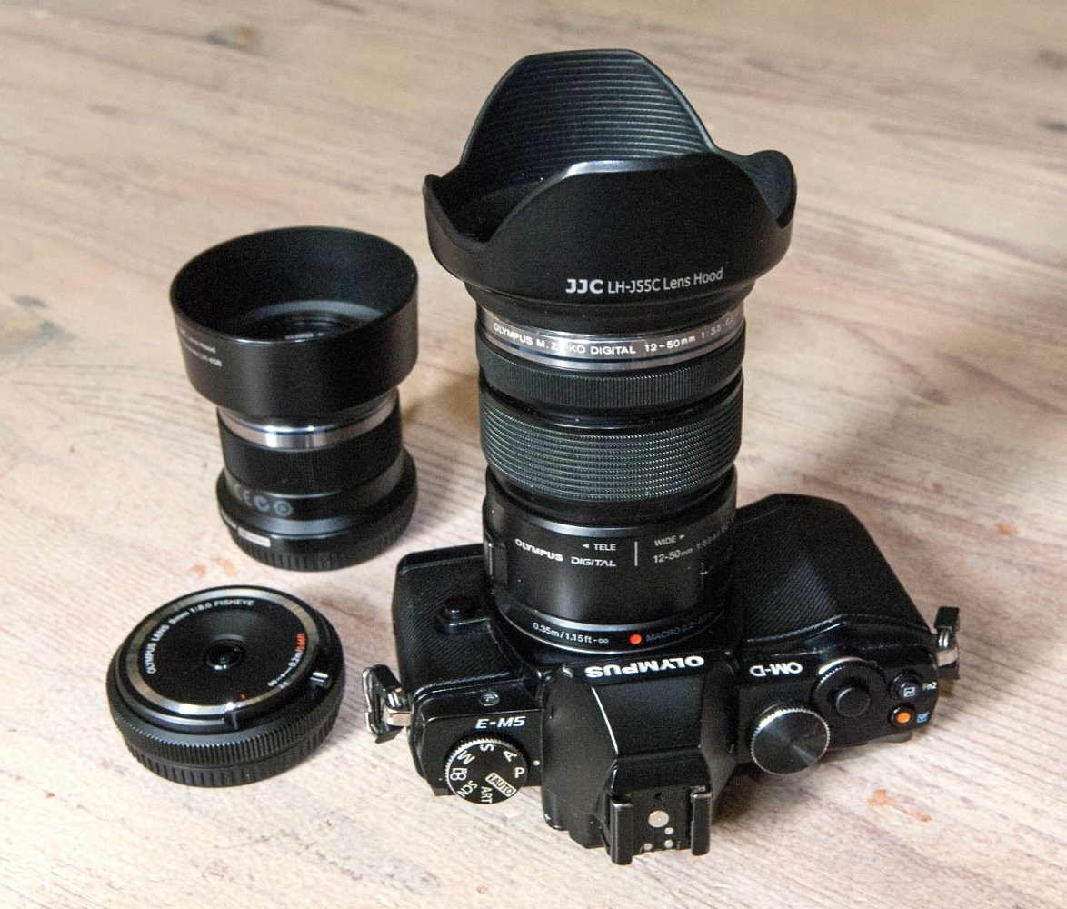 Meine Frau wählte für ihre spiegellose, kleine Olympus OMD EM-1 das ebenfalls Spritzwasser- geschützte 12-50mm (24-100mm*), das lichtstarke 1,8/45mm (90mm*), ergänzt durch das sehr brauchbare, winzig kleine 9mm (18mm*) Fischauge. * Kleinbildentsprechung